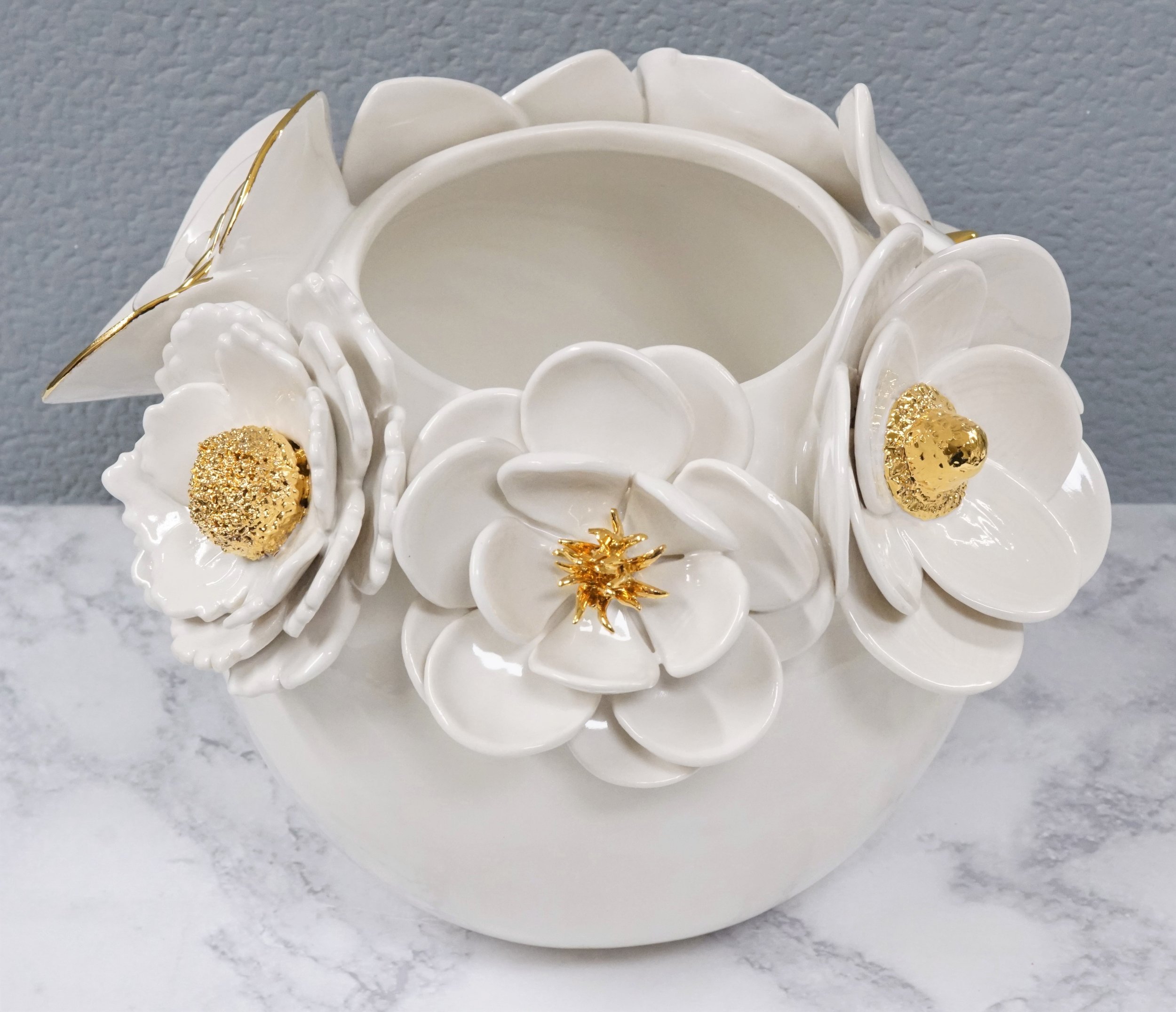 After painting nearly all my life, a freak accident several years ago almost caused a total loss of use of my right hand and lower arm --but, amazingly this actually led me into Ceramics in a very unexpected way. My Physical Therapist suggested using clay to rehab my injury, and it was love at first ‘squeeze”! Not only did it help heal my injury better than the Doctors expected without needing surgery, it opened up a whole new world for me! Now, along with my sculptural paintings, I create unique floral-inspired sculptures and vessels that are hand-built from porcelain clay and intricately detailed with real 22kt gold to give each piece an heirloom quality. I choose porcelain as my preferred clay because of both its extreme strength as well as how it holds such delicate forms.
